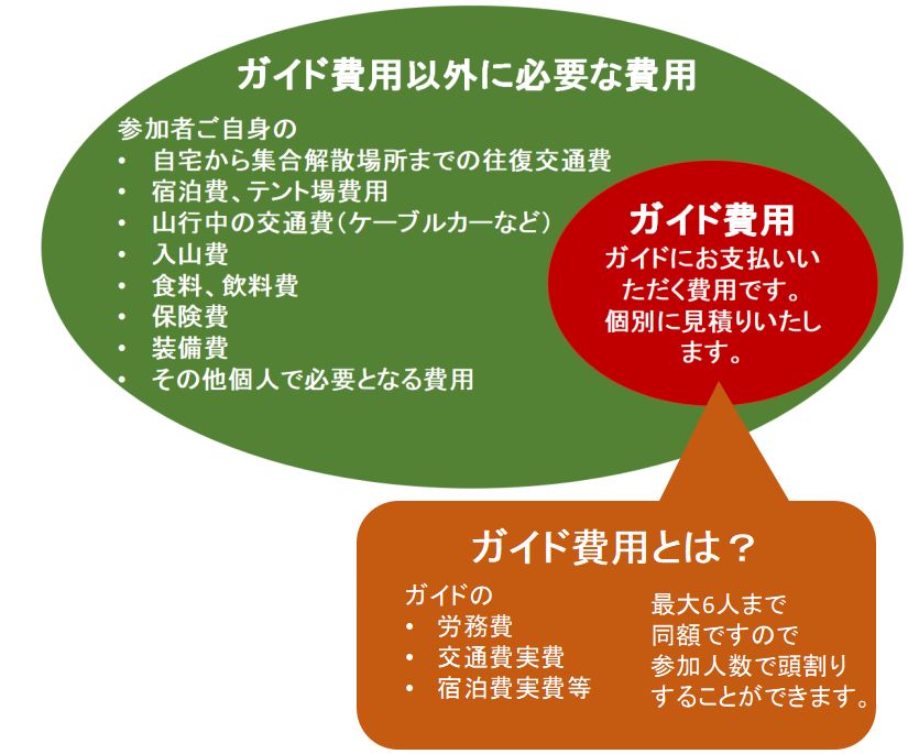 ガイド費用以外に、参加される方のご自宅から集合・解散地点までの往復の交通費、登山口までのバス・タクシー代、山行中のロープウェイなどの交通費、食費、宿泊費、入山料、保険料等はガイド料金以外に必要となります。