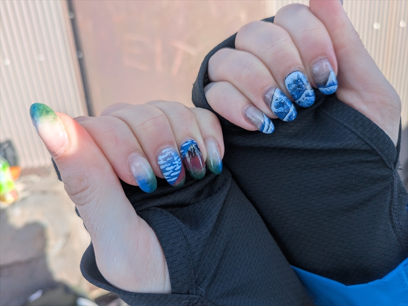 どれだけ日本が好きかというと奥さんの爪が北斎の赤富士と神奈川沖浪裏になっています。 マイアミで日本人のネイリストにやってもらったということでした。 富士山に登る準備万端!