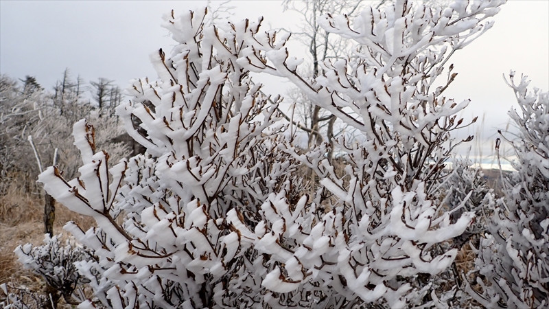 低木の枝は霧氷がびっしりとついています。