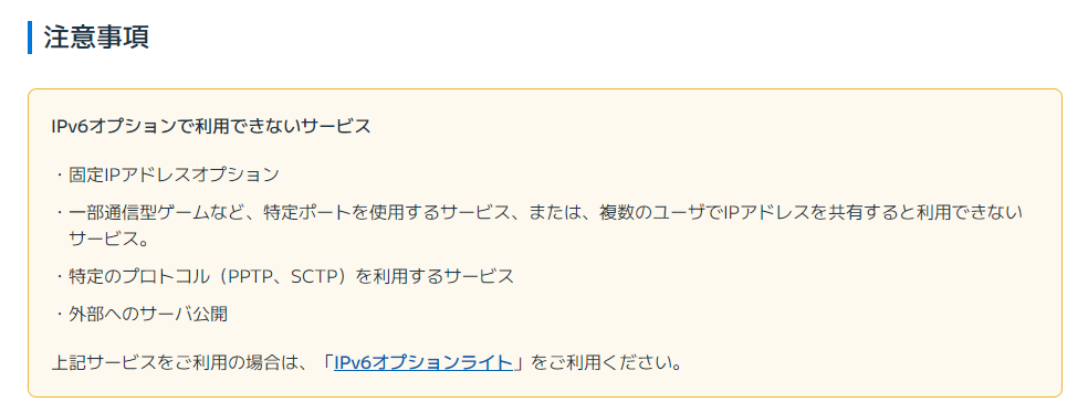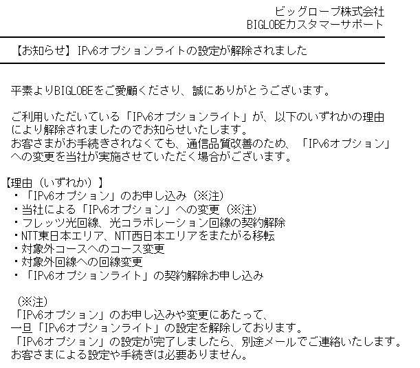 現在の設定が「IPv6オプション」であり、外部へのサーバー公開ができない、やるなら「IPv6オプションライト」に変更しろというもの。 このオプションライトのサービス自体は無料です。 そういえばビッグローブがIPv6対応になった時にもこんなメールがきて「IPv6オプションライト」に設定したことを思い出しました。