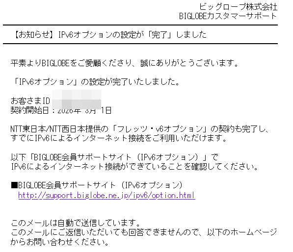 今回何もビッグローブには変更(IPv6オプションライトからIPv6オプションへ戻すこと)など申し込んでいないにもかかわらず、この変更がなされた背景を想像するに、ドコモ光に10Gbpsへの変更を申し込んだことが発端だと思いました。 こちらからは何も変更など要求していないし、10Gbpsのサービスも開始されていないし、そもそも100Mbpsから10Gbpsへの工事も始まっていない(工事担当者から連絡が来ていない)にもかかわらず、ドコモ光が何らかの設定作業を開始したため、ビッグローブでこれをトリガにしてIPv6のオプション設定が変わったことに間違いありません。 問題としてはビッグローブ側でもともとの設定に戻さないことが原因なのですが、ドコモ光にも勝手に工事開始の連絡もなく、設定の切り替え作業を進めたことにも原因があります。